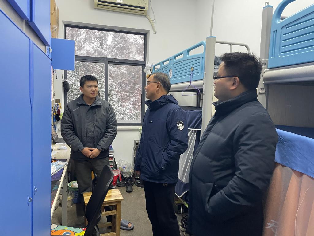 能环学院党委书记谢文平,副书记卫军帅、毕业生辅导员吴飞前往大四学生寝室一一进行了走访慰问,对近70个学生宿舍的考研同学们送去冬日的温暖问候。楼外大雪纷飞,寒风冷冽,楼内师生融洽,暖意洋洋。谢文平询问同学们考研复习情况,与同学们深入交流,叮嘱同学们在全力学习之余也要保持身体健康;天气寒冷,要防寒保暖,尤其要注意保持寝室卫生,严格做到人走断电,不留安全隐患。卫军帅也向同学们传授临场发挥的考试经验,鼓励同学们抓住最后一周的时间努力冲刺,不让自己的青春留下遗憾。此前,卫军帅和吴飞也多次深入自习教室、图书馆等地陪伴学生学习交流解惑。“在背书之余看到老师们关切的身影,脸上那种惊喜和信任是隐藏不住的”,同学们纷纷表示,老师们经常走访慰问学生,能给他们带来内心的强大动力,感谢老师们用温暖和关爱陪伴学生快乐学习考研成长。